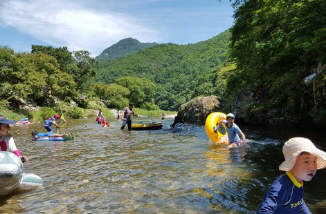 캠핑장 바로 옆에 위치한 구천동 계곡은 계곡이 길고 넓어 작은 아이들부터 어른까지 물놀이 하기에 좋은 수심을 가지고 있습니다.